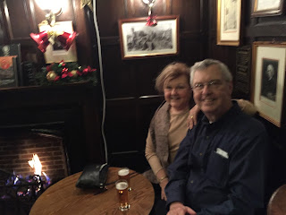 | My husband and I near the fire at Christmas time at Ye Olde Mitre Tavern. (Sons opted to drink outside.) |